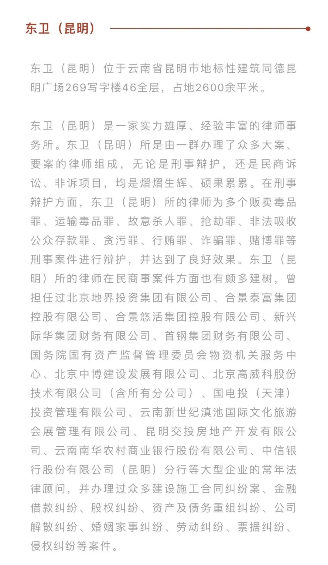曾在某省高级人民法院刑事审判庭工作,期间全程参与提讯、开庭审判、合议庭讨论等环节,辅助法官办理过重大职务犯罪、运输毒品、故意伤害、故意杀人等案件一百余件。2019年转岗成为律师,期间参与办理各类刑事案件五十余件,其中包括数起重大职务犯罪案件以及涉黑涉恶案件,2019年中国刑事律所联盟第四届模拟法庭竞赛优胜奖。现就职于北京东卫(昆明)律师事务所。