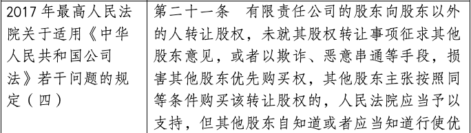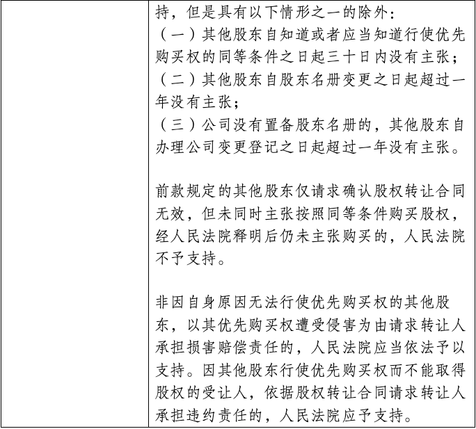 2017年《公司法司法解释(四)》首次对侵害优先购买权的后果作出细化规定。明确“其他股东主张按同等条件购买股权的,人民法院应予支持”,同时设置“三十日行使期”与“一年除斥期”,并限制“仅请求确认合同无效而不主张购买”的滥用行为,初步填补了规则空白。