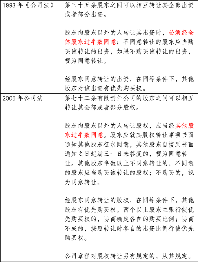 2005年《公司法》修订对优先购买权规则进行优化,将“全体股东过半数同意”改为“其他股东过半数同意”,并增设“视为同意转让”的推定规则。