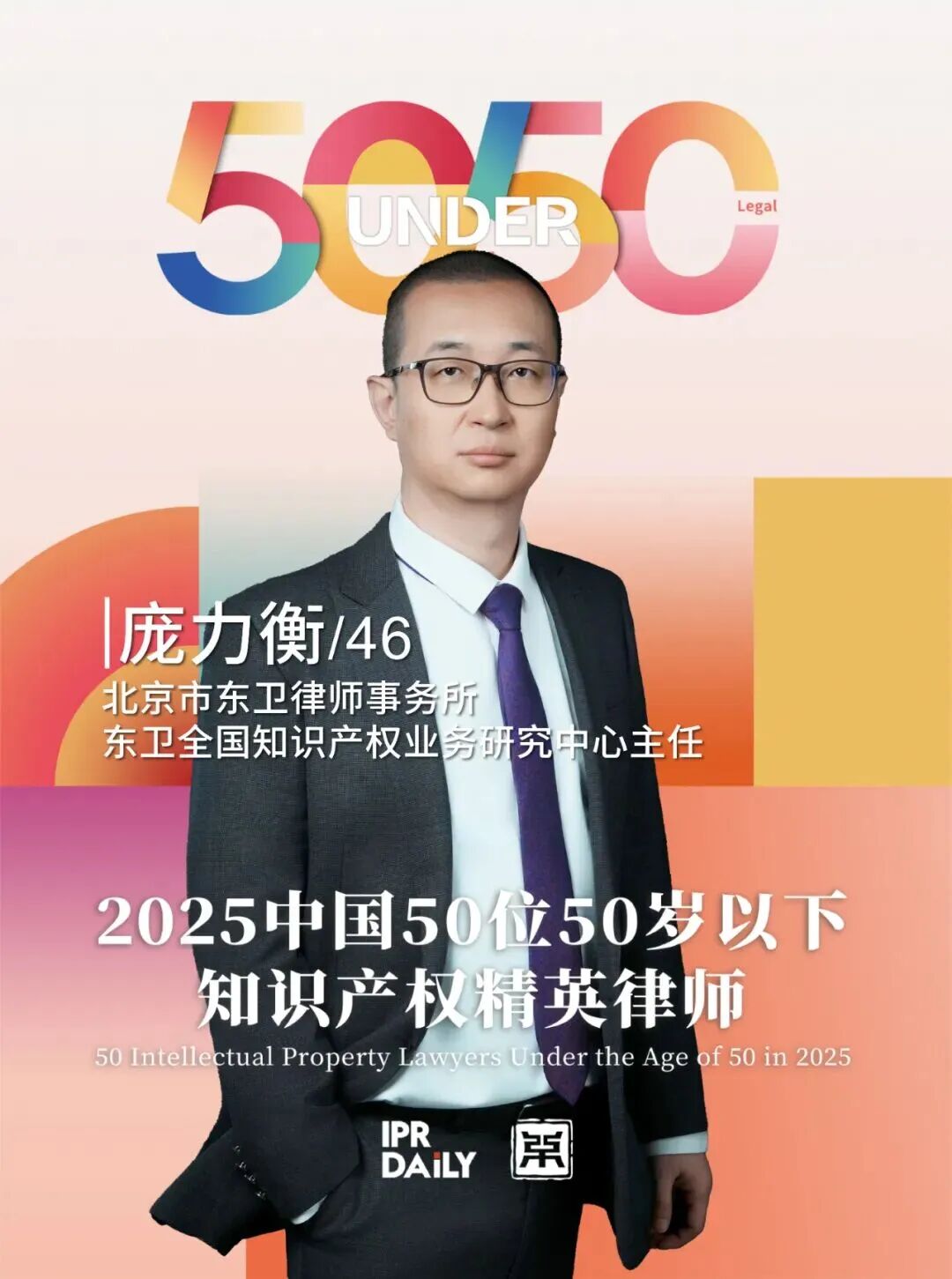 为彰显行业典范,激励更多优秀人才投身知识产权法律事业,IPR Daily与中策知识产权研究院共同发起“中国50位50岁以下知识产权精英律师”(U50)年度评选。近日榜单公布,凭借优秀的法律服务能力和良好的客户口碑,北京市东卫律师事务所联席合伙人、东卫全国知识产权业务中心主任庞力衡律师荣登该榜单。