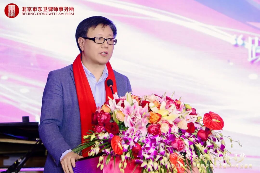 中国人民大学法学院副院长程雷教授代表中国人民大学法学院向全体东卫人表达了祝贺与祝福。他表示,在律师行业普遍承压的背景下,东卫律所能实现高速增长且专业建设日趋深化,令人惊喜与钦佩。他观察到东卫在坚持“学院派”底色、布局全国分所差异化发展以及强化党建引领等方面形成了鲜明特色,对东卫的未来发展表示期待。
