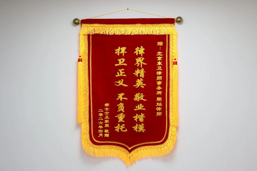 2026年4月13日上午,郝某及家属将一面写有“律界精英、敬业楷模,捍卫正义、不负重托”的锦旗,以及一捧春意盎然的花束,送至北京市东卫律师事务所总部,向周灿律师致以诚挚的感谢。