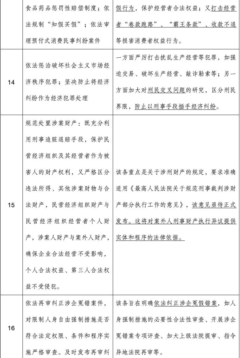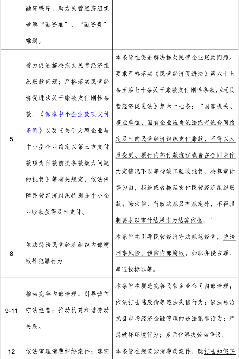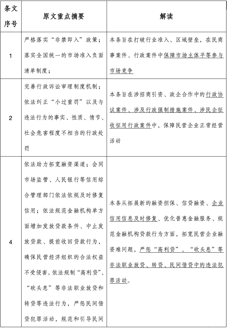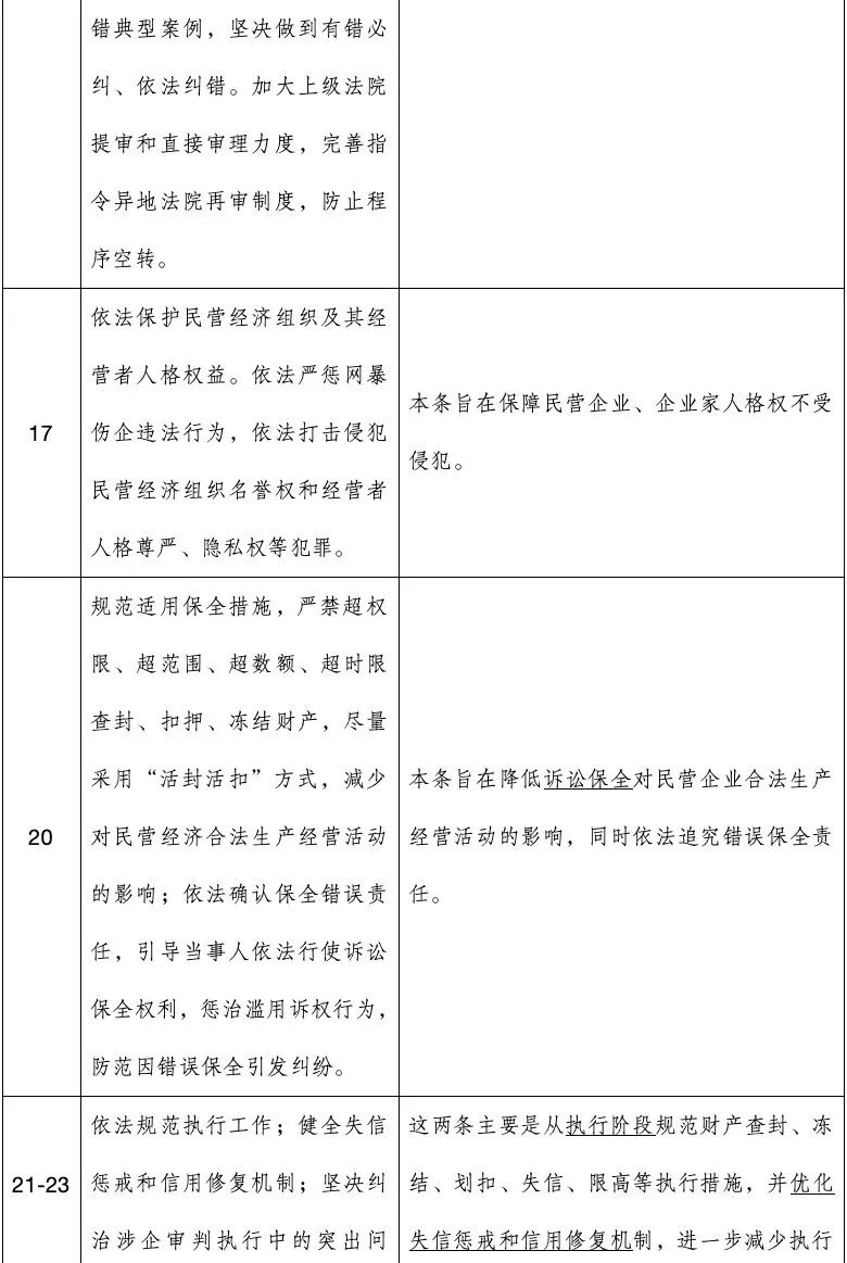 意见一共25条,主要内容包括:一是以依法平等保护增强信心。既多措并举,保证民营经济组织公平参与市场竞争,又坚持问题导向,助力民营经济组织拓宽融资渠道,促进解决账款拖欠问题,保护民营经济组织科技创新,促进新兴产业健康有序发展。二是引导规范经营夯实基础。通过颁布司法解释、发布典型案例、调研指导、案件审理等方式,惩治民营经济组织内部腐败等犯罪行为,引导民营经济组织规范内部治理、诚信合法经营,规范用工、保护消费者合法权益。推动民营经济进一步发展,服务保障民营经济组织安全“出海”。三是以严格公正司法稳定预期。要求依法加强产权司法保护,规范处置涉案财产,依法纠正涉企冤错案件,保护民营经济组织及其经营者人格权益,保护民营经济组织及其经营者合法权益。四是以善意文明司法激发活力。在立案、审判、执行全过程,优化诉讼服务,降低民营经济组织解纷脱困成本。完善失信惩戒和信用修复机制,扎实开展规范涉企执法司法专项行动,有力有效整治不规范执行行为,最大限度降低对企业正常生产经营的影响。提升涉外审判效能、加强法治宣传,不断增强司法服务供给。最高人民法院从司法实践角度,在民事保障、刑事防范、行政平等保护的层面,从案件审理、执行举措、商业信誉、权利保护等等方面,增强民营企业信心。笔者对该《指导意见》部分条文列表解读如下: